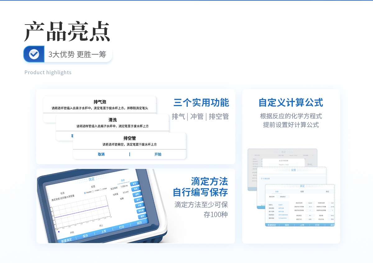 | 1、设备支持电位滴定和pH值测量;用户选择不同电极可进行酸碱滴定、氧化还原滴定、沉淀滴定、络合滴定等多种滴定和pH测量; | 2、用户可选配电导滴定、永停滴定等扩展模块,满足用户多功能需求; | 3、设备对国家标准中采用的电位滴定法均满足,用户可根据检测需求选择适配的电极即可; | 4、支持动态滴定、等量滴定、手动滴定的滴定方式,可预设滴定终点或自动识别终点滴定,方便用户根据样品特性选择**滴定工作流程; | 5、可自定义计算公式,根据反应的化学方程式提前设置好计算公式,滴定完成后将自动获得待测物含量; | 6、滴定方法可自行编写并保存,形成滴定方法快捷模式,在使用时可直接选择运行,滴定方法至少可保存100种; | 7、设备可作为实验室常规手动滴定的滴定装置使用;计量泵替代滴定管,磁力搅拌功能替代手动摇晃锥形瓶的工作; | 8、仪器实用的三个功能: (1)排气,可将滴定管或管路内的气泡排出,避免气泡带来的滴定误差; (2)冲管,可以*少的试剂消耗量使管路内充满试剂,实现节省试剂的同时减少试剂混合引入的滴定误差; (3)排空管,可在实验完成后将管路中的液体收集到滴定管内,避免在拆卸管路时产生药液溅洒问题。 |