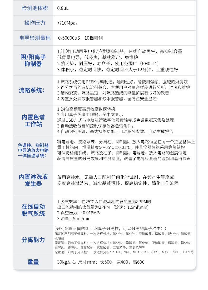 微处理器控制的双柱塞往复泵,采用**的智能控制算法,能使泵的流量脉动降至**水平。 1.1,材质:镶嵌式PEEK材料无阻尼泵头,PEEK管路,适合于pH为0~14的淋洗液及反相有机溶剂。 1.2,流量范围:0.001~9.999ml/min,增量0.001ml/min。 1.3,流量设定值误差:≤0.1% 1.4,流量稳定性:≤0.1% 1.5,工作压力:35MPa 1.6,过压保护:工作压力超过或低于设定的上限或下限时,泵将自行关闭且报警。 | 2 电导检测器: 2.1,原理:五极电导检测器 2.2,电极材料:钝化316L不锈钢 2.3,基线噪音:≤0.002μS/cm 2.4,基线漂移:≤0.008μS/cm·30min 2.5,zui小检出浓度:≤0.0005ug/mL(以Cl-计) 2.6,仪器线性:≥0.9995 2.7,定量重复性:≤0.1%(以Cl-计) 2.8,定性重复性:≤0.1%(以Cl-计) 2.9,测量范围:0~50000us/cm 2.10,分辨率:≤0.0020ns/cm 2.11,检测池体积:0.8uL 2.12,操作压力:≤10Mpa。 2.13,电导检测量程: 0-50000uS,10档可调。 | 3、 阴、阳离子抑制器: 3.1连续自动再生电化学微膜抑制器,在线自动再生,高抑制容量,低背景电导,低噪声,基线稳定,免维护。 3.2抗污染,耐压好,寿命长,使用范围广(PH0-14)。 3.3体积小,稳定时间快,稳定时间不大于12分钟,且重现性好。 | 4 流路系统: 4.1流路系统使用PEEK材料制造,通用性好,能使用强酸、强碱的淋洗液。 4.2百分之百的有机溶剂兼容,方便用户对复杂样品进行分析、冲洗和维护。 4.3 结构紧凑,流路*短,对流路造成的峰型扩展有很好的改善。 4.4 内置多处漏液报警器和缺水报警器,全方位安全监控。 | 5 内置色谱工作站: 5.1 24位高精度高灵敏度数模转换。 5.2专用离子色谱工作站,全中文显示,通过USB方式与电脑进行数字信号传输,完成色谱数据采集及处理。 5.3自动接收分析和控制保存仪器色谱条件。 5.4自动识别负峰、基线扣除功能。自动积分参数、自动生成报告。 | 6 色谱柱、抑制器、电导池、放大电路一体恒温系统: 将电导池、流路系统、分离柱、抑制器、放大电路恒温在同一个控温基体上置于柱箱内,恒温精度5~65℃±0.01℃。并且仪器柱箱采用绝热结构,可保持检测系统、流路及柱子、抑制器、电导池、放大电路的温度恒定,获得高质量的分离效果和检测精度,改善了电导检测器的温飘和基线噪声。 | 7内置淋洗液发生器,仅用高纯水,无需人工配制任何化学试剂,在线产生等度或梯度高纯淋洗液,减少基线漂移,提高稳定性,简化工作流程。 | 8 在线自动脱气系统: 1,脱气效率:在25℃入口流动相的含氧量为8PPM时,出口流动相的含氧量为2PPM (流速:1.5ml\min) 2,真空压力:-0.018MPa 3,流量:5mL/min | 9 分离能力:(分别配置不同的阴、阳离子分离柱,可以分离的离子种类:) 配置国产阴离子分离柱:一次进样分析:氟化物、氯化物、亚硝酸盐、磷酸盐、溴化物、硝酸盐、硫酸盐 配置进口阴离子分离柱:一次进样分析:氟化物、溴酸盐、氯化物、亚硝酸盐、磷酸盐、溴化物、硝酸盐、硫酸盐、亚氯酸盐、高氯酸盐、二氯乙酸、三氯乙酸等 配置进口阳离子分离柱:一次进样分析::Li+、Na+、NH4+、K+、Ca2+、Mg2+、Sr2+、Ba2+等 | 10 重量:30kg左右 尺寸mm:长500,宽400,高600 |