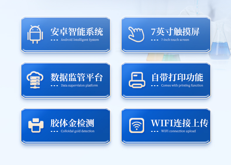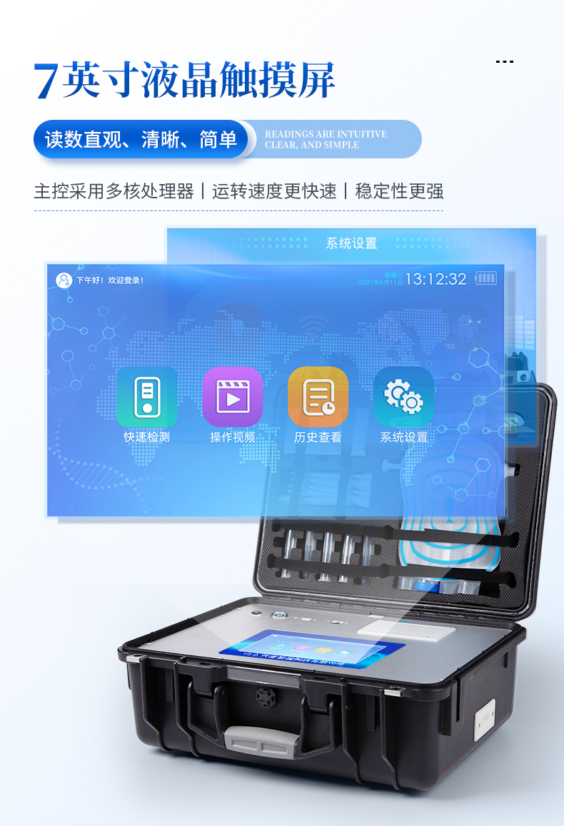 | 仪器采用手提式一体化系统检测技术,将分光光度模块、新型农残检测模块、数字化管理模块、无线通讯模块高度集成于一体,支持检测200种食品安全检测项目,同时预留升级检测方法。 | 仪器检测模块标准化、智能化,检测项目可随意自由组合。检测箱体内置多个标准检测单元,检测模块可以调整配置。 | 显示屏幕:仪器采用10.1英寸竖向液晶触摸屏显,搭配运行安卓智能操作系统,主控芯片采用ARM Cortex-A7,RK3288/4核处理器,主频1.88Ghz,操作方便,性能更强。 | 检测通道:≥12通道;采用精密旋转比色池设计,使用同芯片同光源校准精度,解决不同光源之间的误差值,更加准确**。(1-12通道间误差0.1%,***:**202022821055.2) | 仪器光源:高精度进口四波长冷光源,每个通道均配置 410、520、590、630nm 波长光源,标配**的光路切换装置,专利光路切换功能可实现64波长,并且所有检测项目可实现所有通道同时检测。 | 设备可一键校准,自动保存校准数据,自动对比校验,得到精准光源,采用Android SP存储数据,光源数据永不丢失,方便每一次使用。 | 通讯接口:配备无线通信模块、4G(APN)通讯模块、蓝牙传输,同时具有双USB接口以及RJ45网线接口,可以多方式实现数据保存及数据传输 | 存储方式:支持U盘存储,标准USB接口,免驱动安装。检测结果存储容量20万条以上,可生成Excel表格进行拷贝,并具有登录保护功能。 | 智能化操作系统: | 1)操作系统:仪器可在同一检测界面自动对应相关检测通道,一次性选择1-12个样品名称,无需退出界面,节省操作时间。并可以对每个通道属性和样品信息单独进行编辑,例如送检单位、人员,检测人员等,打印时勾选打印显示。 | 2)数据集成系统:设备首页自动汇总分析检测数据,包含:周检测数据、月检测数据,全部检测总数量,均包含检测总数,合格数,不合格数,以及相关柱形分析图,各项检测数据一目了然,无需电脑查询,更加快捷直观。 | 3)数据库系统:十几项数据库分类管理仪器:包含项目类型、项目数据、检测数据、历史记录、国标信息、曲线信息、采样信息、检测信息、受检信息、复核信息、图表信息、光源校准信息、打印样式信息、样品库信息等等,数据库之间互相协调联动保证数据的真实完整性。同时产品数据库以及历史检测记录支持一键检索功能。 | 4)限量规判系统:具有限量查询、添加物质合规判定系统。检测出结果后,系统自动调用系统数据库中相关国标进行比对判定,客观显示判定结果是否合格。 | 5)项目预设系统:仪器具有任务预设模块,一键提前预设,给出方便快捷的新检测方案,每一个任务分别可以设置不同的样品、批次、编号、来源、备注、抽样信息、检测信息、受检信息、复核信息等更多信息。样品送检时一键调取保存信息,并可多次调取,大大提高检测效率。 | 6)数据监管系统:同步对接监管平台,数据可局域网和互联网数据上传,检测结果可选择直接传至食品安全监管平台。进行区域食品安全监管及大数据分析处理与数据统计,检测区域食品安全长短期动态,达到食品安全问题预估、预警。 | 7)打印系统:内置全新打印机,新创自定义打印方式,可按需灵活勾选控制:产品合格证(国家农业部标准要求),二维码,抽样信息、检测信息,受检信息、复核信息、抽样日期、检测日期等信息的打印。 | 供电模式:仪器交直流两用,直流12V供电,可连接车载电源,可配6ah大容量充电锂电池,电量可实时显示,方便户外流动测试。 | 胶体金检测模块:采用双通道CMOS成像处理技术及胶体金免疫层析技术,可同时读取双胶体金卡数据,自动采集、处理分析,将检测结果显示,并可根据参考限值自动判断检测结果,可检测常见的兽药残留、生物毒素、抗生素、违禁添加物等。 | 1)探测技术:CMOS成像探测; | 2)检测通道:1个通道; | 3)检测方式:消线法和比色法; | 4)显示模式:阴性或阳性; | 5)曲线形式:轨道式扫描方式,显示金标卡图像,实时生成、识别CT曲线图,无需手动调整,完成检测后自动退出检测卡。兼容市场上其他金标卡,使用耗材不受限制。 | 仪器加入远程升级功能,可定向分客户分仪器更新,开机后自动更新,客户无需任何操作,即可升级全新项目。做到了无需退换机器即可实现实时远程升级检测仪器。 |