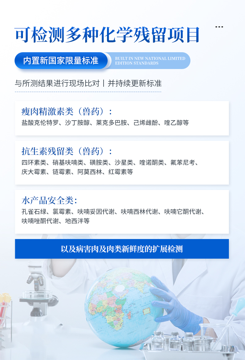 该多功能食品安全检测仪为集成化食品安全快速检测分析设备,广泛应用于市场监管局、食品肉产品深加工企业、学校食堂、卫生部门、畜牧部门、屠宰场、检验检疫部门等单位使用。