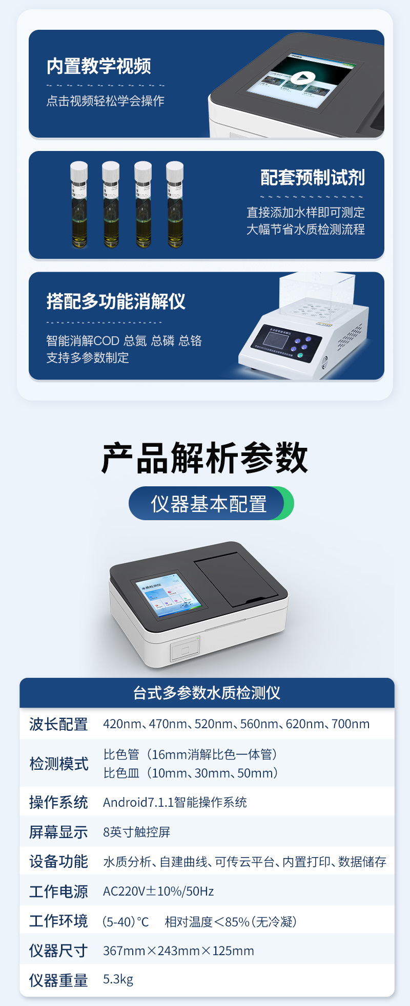 | Android智能系统,操作交互性体验更好,更佳简便快捷; | 3.5寸高清晰度触控屏幕,数据更直观 | 配置监管平台,检测结果可直接无线传至平台,进行水质长短期分析,辅助管理。 | 内置操作流程、操作简单、无需培训、直接上手; | 检测速度更快,现场读取数据; | 便携式体积小,重量轻,方便户外检测; | 外形小巧美观,工作稳定免维护,具有较好的性价比; | 采用进口冷光源,光学性能稳定,寿命长达10万小时; | 交直流两用,内置充电锂电池,环保耐用可支持连续室内外工作。 |
