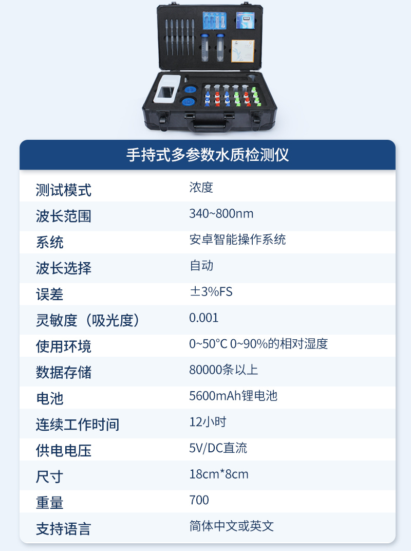| 依据标准: GBT 7493-87 | 量程 :0.005 ~0.4 mg/L | 检测方法 :光电比色 | 测试模式 :浓度 | 波长范围 :340~800nm | 系统:安卓智能操作系统 | 波长选择 :自动 | 显示屏幕 :3.5寸彩色液晶触摸屏 | 稳定性 :<0.5% | 灵敏度(吸光度): 0.001 | 使用环境: 0~50℃ 0~90%的相对湿度 | 数据存储 :80000条以上 | 通讯: Type-C、WIFI、蓝牙 | 电池 :5600mAh锂电池 | 连续工作时间 :8小时 | 供电电压: 5V/DC直流 | 尺寸 :18cm*8cm | 重量:700g | 支持语言:简体中文或英文 |