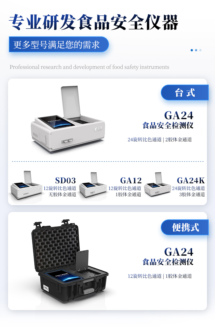 | 仪器采用手提式一体化系统检测技术,将分光光度模块、胶体金检测模块、新型农残检测模块、数字化管理模块、无线通讯模块高度集成于一体,支持检测200种食品安全检测项目,同时预留升级检测方法。 | 仪器检测模块标准化、智能化,检测项目可随意自由组合。检测箱体内置多个标准检测单元,检测模块可以调整配置。 | 显示屏幕:仪器采用10.1英寸液晶触摸屏显,搭配运行安卓智能操作系统,主控芯片采用ARM Cortex-A7,RK3288/4核处理器,主频1.88Ghz,运转速度更快速,性能更强。 | 检测通道:≥12通道;采用精密旋转比色池设计,使用光源芯片一致,可以解决各通道间由于光源芯片不同带来的检测结果误差问题,检测结果更加精准,1-12通道间误差0.1%,***:**202022821055.2。 | 仪器光源:高精度进口四波长冷光源,每个通道均配置 410、520、590、630nm 波长光源,标配**的光路切换装置,专利光路切换功能可实现*多64波长,并且所有检测项目可实现所有通道同时检测 | 设备具备开机自动校准及一键校准功能,确保检测数据结果准确。 | 通讯接口:配备无线通信模块、4G(APN)通讯模块、蓝牙传输,同时具有双USB接口以及RJ45网线接口,可以多方式实现数据保存及数据传输。 | 存储方式:支持U盘存储,标准USB接口,免驱动安装。检测结果存储容量20万条以上,可生成Excel表格进行拷贝,并具有登录保护功能。 | 智能化操作系统: 操作系统:可在同一检测界面自动对应相关检测通道,一次性选择1-12个样品名称,无需退出界面,节省操作时间。检测通道可以分别打开与关闭并对检测通道属性和样品信息进行编辑,例如送检单位、人员,检测人员等,打印时一并显示。 数据集成系统:设备首页自动统计检测数据,包含:周检测数据、月检测数据,全部检测总数量,均包含检测总数,合格数,不合格数,以及相关柱形分析图,对各项检测数据清晰掌握,无需电脑查询,更加快捷直观。 数据库系统:具有多品类多种类样品菜单功能,并且构建了完善的检索、修订功能。食品库涵盖多种菜单库100多种蔬菜名称,可按需添加或删除、编辑蔬菜名称;不同的检测通道可同时检测不同的样品,产品数据库以及历史检测记录支持一键检索功能。 限量规判系统:具有限量查询、添加物质合规判定系统。检测出结果后,系统自动调用系统数据库中相关国标进行比对判定,客观显示判定结果是否合格。 项目预设系统:仪器具有任务预设模块,可在样品送检前提前预设样品名称、检测指标、送检单位、检测单位等信息,样品送检时一键调取保存信息,并可多次调取,大大提高检测效率。 数据监管系统:同步对接监管平台,数据可局域网和互联网数据上传,检测结果可选择直接传至食品安全监管平台。进行区域食品安全监管及大数据分析处理与数据统计,检测区域食品安全长短期动态,达到食品安全问题预估、预警。 自定义打印系统:内置热敏打印机;系统打印格式多样化,产品合格证(国家农业部标准要求),二维码,抽样信息、检测信息,受检信息、复核信息、抽样日期、检测日期等信息结果,可按实际需求自行设置开启或关闭,并完成打印。 | 供电模式:仪器主机采用一体化防水、抗压、防撞击、防腐蚀机体设计,可直接使用交流电源;内置6ah大容量充电锂电池,可连续使用8小时以上,满足脱电情况下检测需求。 | 胶体金检测模块: 采用双通道CMOS成像处理技术及胶体金免疫层析技术,可同时读取双胶体金卡数据,自动采集、处理分析,将检测结果显示,并可根据参考限值自动判断检测结果,可检测常见的兽药残留、生物毒素、抗生素、违禁添加物等。 探测技术:CMOS成像探测; 检测通道:3通道,可同时读取3个胶体金卡数据; 检测方式:消线法和比色法; 显示模式:阴性或阳性; 曲线形式:轨道式自动传输扫描方式,可实时显示金标卡图像,系统自动分析并呈现出CT曲线图,CT线自动识别,无需手动调整,完成检测后自动退出检测卡。兼容市场上其他金标卡,使用耗材不受限制。 | 仪器后期可根据实际使用需求按项目升级。 |