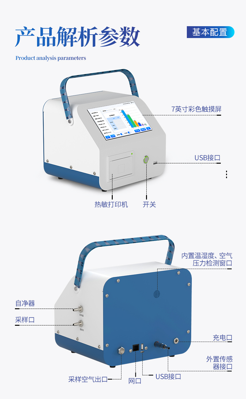 | 采样量:2.83L/min (0.1cfm) | 六粒径通道:0.3,0.5,1.0,3.0,5.0,10.0(μm) | 自净时间:≤10min | 粒径分布误差:0.5um 5um ≤±30% | 粒子浓度示值误差:0.5um ≤±30% | 测量重复相对偏差:≤±10% | 使用环境:工作环境15~35℃, 10-85%RH | 采样周期:可从1秒至30000秒开始任意设定 | 采样延时:≤60s | 测量间隔:≤60s | 采样方式:单次、≤99次(自定)、连续 | 报警功能:通过设置报警参数实现颗粒数报警 | 光源:进口半导体激光二极管(寿命大于30000小时) | 屏幕显示方式:7寸彩色触摸屏 | 数据内存容量:1--10万条,可查询,可导出。 | 充电时间:3小时 | 设计工作时间:8小时 | 工作功率:25W | 内置电池:220Wh(16.8V/15Ah) | 充电器:84W(16.8V/5A) |