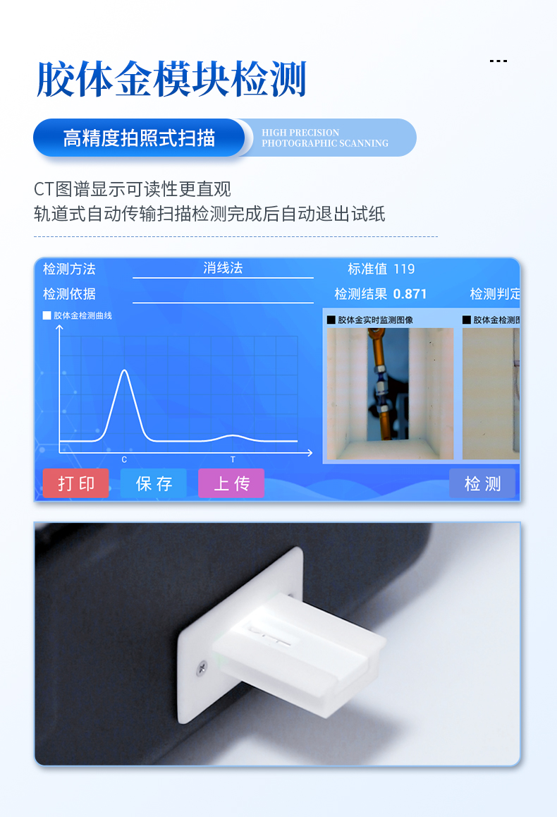 6、胶体金模块检测方式:轨道式自动传输扫描,检测完成后自动退出检测卡。