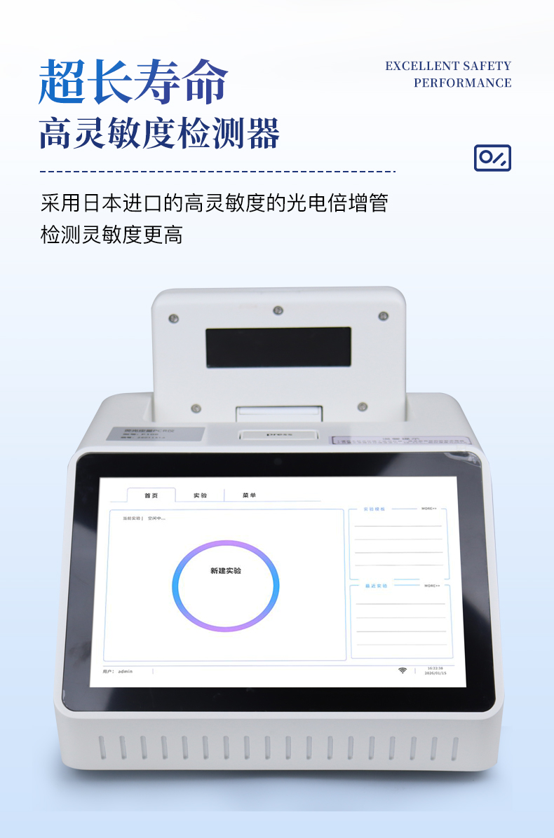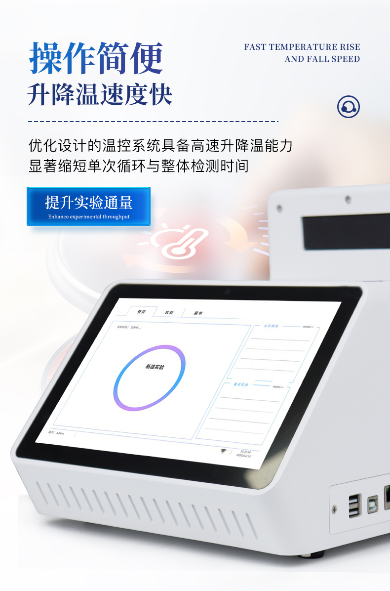 | 1.智能操作系统,实验尽在掌握 | A程序更新与预设:支持在线更新实验程序,并内置丰富的预设实验程序模板,用户亦可自定义保存常用模版,实现一键快速启动,极大提升操作效率。 | B极简启动体验(可选配):可定制集成摄像头扫描系统,用户只需扫描样品板或程序卡的二维码,即可自动识别并调用对应实验程序,简化流程,避免人为设置错误。 | C操作简单:触摸屏界面设计得直观易懂,新用户也能快速上手。预置常用程序模板,进一步简化操作流程。 | 2.精准稳定的温控与光学核心 | A长久精准的温控系统:采用进口***TEC半导体制冷模块,控温精准(±0.1°C),孔间温度均匀性**(≤±0.3°C)。系统稳定性卓越,长期使用性能衰减小,校准周期长达数年,显著降低维护成本与运营中断。 | B免维护的灵敏光学系统:配备2个独立LED光源与2个独立光电二极管检测器,实现双通道荧光同步精准检测。采用超长寿命进口光源,设计寿命期内免维护,无需额外校准或更换,保障检测结果长期一致性与高灵敏度。 | C卓越的数据质量:实验线性相关性高(R²≥0.999),重复性优异(孔间CV值低),确保定量结果准确可靠,数据置信度高。 | 3.**便捷的数据与输出管理 | A多重数据导出方式:支持通过USB存储设备直接拷贝,或经由Wi-Fi无线网络传输数据至本地服务器或云端,方便灵活,满足各类实验室数据管理习惯。(可选配) | B丰富的报告导出与打印:支持生成并导出多种格式(如PDF、Excel)的实验报告。仪器兼容USB热敏打印机、蓝牙无线打印机及常规A4打印机,可直接在仪器上或通过电脑一键导出并打印专业报告,便于结果存档与即时分享。 | 4.快速**与坚固耐用 | A升降温速度快:优化设计的温控系统具备高速升降温能力,显著缩短单次循环与整体检测时间,提升实验通量。 | B超长使用寿命:核心部件均选用工业级耐用材料与设计,整机运行稳定可靠,致力于为用户提供长久的投资回报。 |