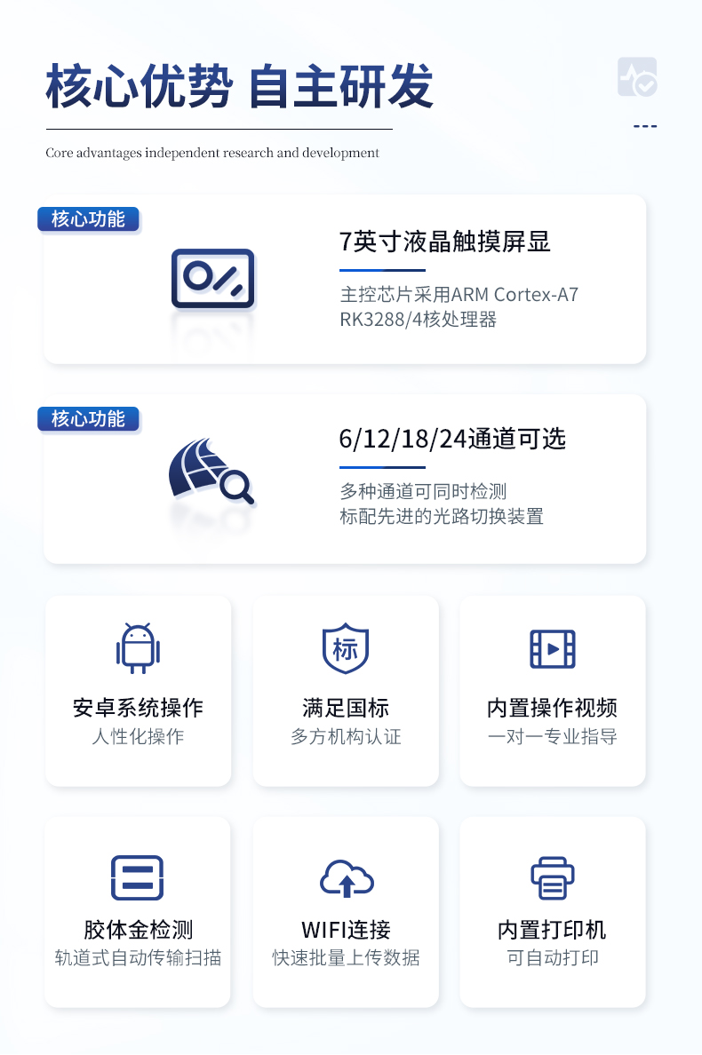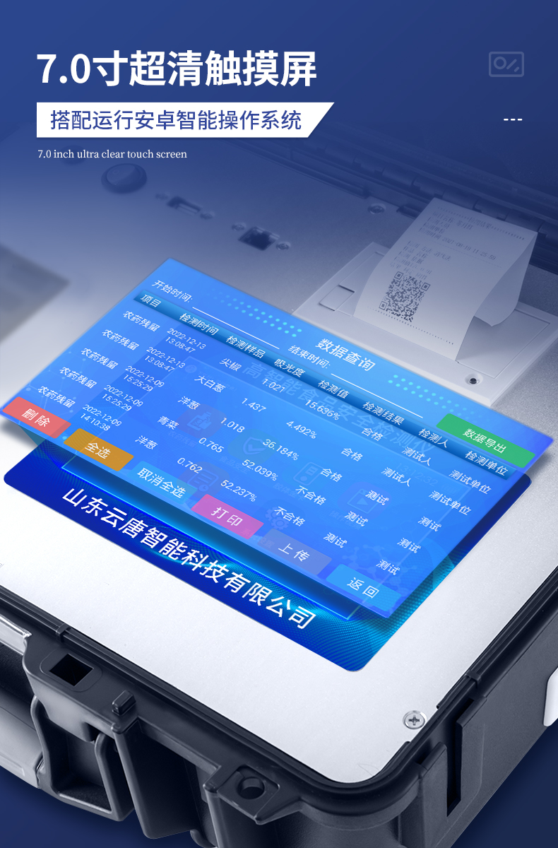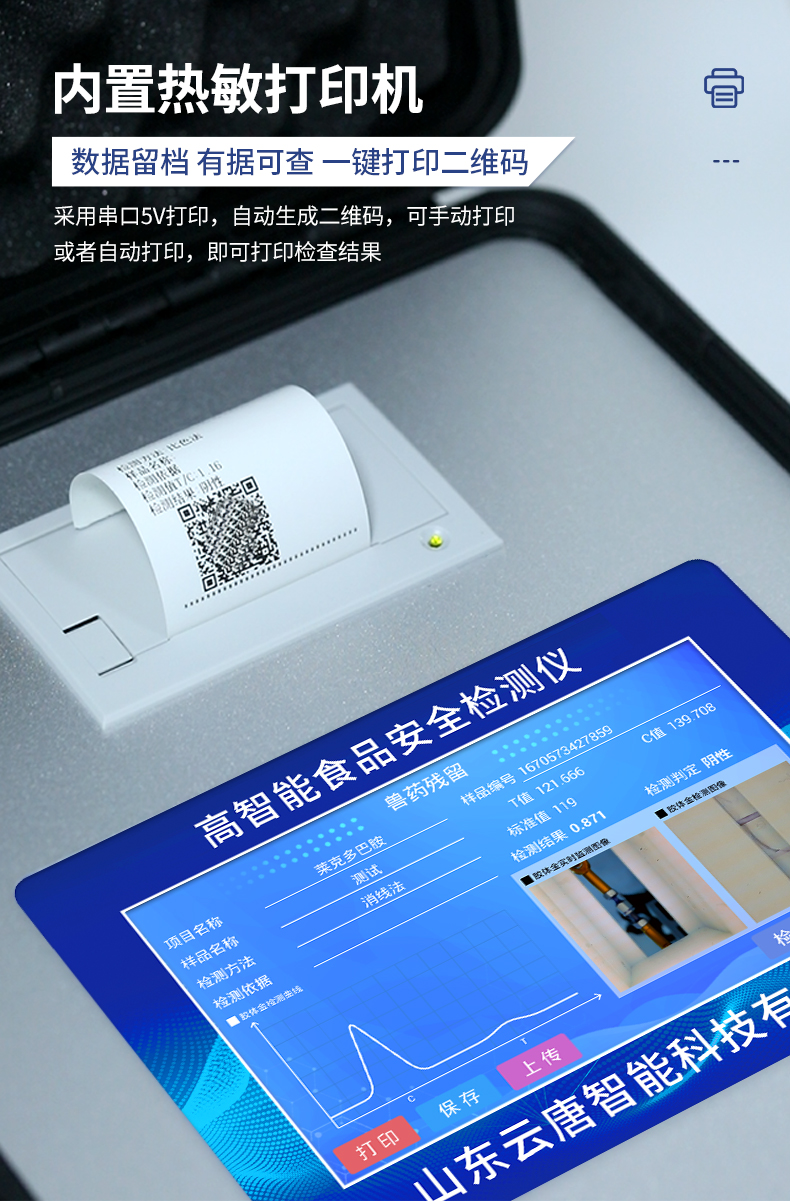 | 仪器采用手提式一体化系统检测技术,将分光光度模块、胶体金检测模块、新型农残检测模块、数字化管理模块、无线通讯模块高度集成于一体,支持检测200种食品安全检测项目,同时预留升级检测方法。 | 仪器检测模块标准化、智能化,检测项目可随意自由组合。检测箱体内置多个标准检测单元,检测模块可以调整配置。 | 显示屏幕:仪器采用10.1英寸竖向液晶触摸屏显,搭配运行安卓智能操作系统,主控芯片采用ARM Cortex-A7,RK3288/4核处理器,主频1.88Ghz,操作方便,性能更强。 | 检测通道:≥12通道;采用精密旋转比色池设计,使用同芯片同光源校准精度,解决不同光源之间的误差值,更加准确**。(1-12通道间误差0.1%,***:**202022821055.2) | 仪器光源:高精度进口四波长冷光源,每个通道均配置 410、520、590、630nm 波长光源,标配**的光路切换装置,专利光路切换功能可实现64波长,并且所有检测项目可实现所有通道同时检测。 | 设备可一键校准,自动保存校准数据,自动对比校验,得到精准光源,采用Android SP存储数据,光源数据永不丢失,方便每一次使用。 | 通讯接口:配备无线通信模块、4G(APN)通讯模块、蓝牙传输,同时具有双USB接口以及RJ45网线接口,可以多方式实现数据保存及数据传输 | 存储方式:支持U盘存储,标准USB接口,免驱动安装。检测结果存储容量20万条以上,可生成Excel表格进行拷贝,并具有登录保护功能。 | 智能化操作系统: | 1)操作系统:仪器可在同一检测界面自动对应相关检测通道,一次性选择1-12个样品名称,无需退出界面,节省操作时间。并可以对每个通道属性和样品信息单独进行编辑,例如送检单位、人员,检测人员等,打印时勾选打印显示。 | 2)数据集成系统:设备首页自动汇总分析检测数据,包含:周检测数据、月检测数据,全部检测总数量,均包含检测总数,合格数,不合格数,以及相关柱形分析图,各项检测数据一目了然,无需电脑查询,更加快捷直观。 | 3)数据库系统:十几项数据库分类管理仪器:包含项目类型、项目数据、检测数据、历史记录、国标信息、曲线信息、采样信息、检测信息、受检信息、复核信息、图表信息、光源校准信息、打印样式信息、样品库信息等等,数据库之间互相协调联动保证数据的真实完整性。同时产品数据库以及历史检测记录支持一键检索功能。 | 4)限量规判系统:具有限量查询、添加物质合规判定系统。检测出结果后,系统自动调用系统数据库中相关国标进行比对判定,客观显示判定结果是否合格。 | 5)项目预设系统:仪器具有任务预设模块,一键提前预设,给出方便快捷的新检测方案,每一个任务分别可以设置不同的样品、批次、编号、来源、备注、抽样信息、检测信息、受检信息、复核信息等更多信息。样品送检时一键调取保存信息,并可多次调取,大大提高检测效率。 | 6)数据监管系统:同步对接监管平台,数据可局域网和互联网数据上传,检测结果可选择直接传至食品安全监管平台。进行区域食品安全监管及大数据分析处理与数据统计,检测区域食品安全长短期动态,达到食品安全问题预估、预警。 | 7)打印系统:内置全新打印机,新创自定义打印方式,可按需灵活勾选控制:产品合格证(国家农业部标准要求),二维码,抽样信息、检测信息,受检信息、复核信息、抽样日期、检测日期等信息的打印。 | 供电模式:仪器交直流两用,直流12V供电,可连接车载电源,可配6ah大容量充电锂电池,电量可实时显示,方便户外流动测试。 | 胶体金检测模块:采用双通道CMOS成像处理技术及胶体金免疫层析技术,可同时读取双胶体金卡数据,自动采集、处理分析,将检测结果显示,并可根据参考限值自动判断检测结果,可检测常见的兽药残留、生物毒素、抗生素、违禁添加物等。 | 1)探测技术:CMOS成像探测; | 2)检测通道:1个通道; | 3)检测方式:消线法和比色法; | 4)显示模式:阴性或阳性; | 5)曲线形式:轨道式扫描方式,显示金标卡图像,实时生成、识别CT曲线图,无需手动调整,完成检测后自动退出检测卡。兼容市场上其他金标卡,使用耗材不受限制。 | 仪器加入远程升级功能,可定向分客户分仪器更新,开机后自动更新,客户无需任何操作,即可升级全新项目。做到了无需退换机器即可实现实时远程升级检测仪器。 |