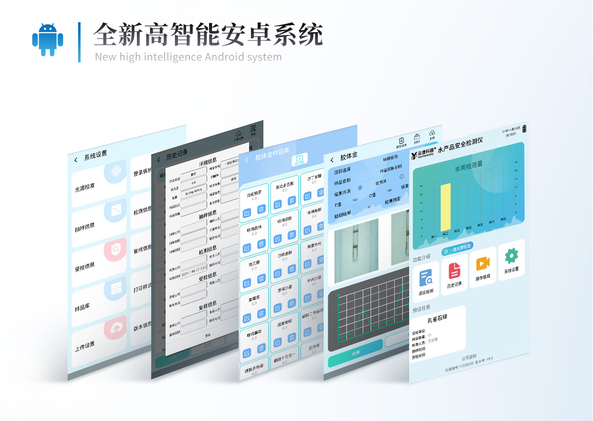 | 仪器采用10.1英寸液晶触摸屏显,搭配运行安卓智能操作系统,主控芯片采用ARM Cortex-A7,RK3288/4核处理器,主频1.88Ghz,运转速度更快速,性能更强。 | 仪器功能包括:胶体金检测模块、数字化管理模块、无线通讯模块等,可以满足同一软件下实现所有检测项目的检测,并在同一窗口展示检测结果。 | 一体化台式快检设备,采用交直流两用供电方式,可连接车载电源,配备6ah大容量充电锂电池,可以满足现场及流动检测使用的需求。仪器尺寸:43×35×20cm, 主机净重:5.1kg | 系统自带数据集成模块,设备首页自动统计检测数据包含:周检测数据、月检测数据,全部检测总数量,均包含检测总数,合格数,不合格数,以及相关柱形分析图,对各项检测数据清晰掌握,无需电脑查询,更加快捷直观。 | 仪器具有任务预设模块,可在样品送检前提前预设样品名称、检测指标、送检单位等信息,样品送检时一键调取保存信息,检测更加方便快捷。 | 直插式自动传输扫描方式,可实时显示金标卡实时图像,系统自动分析并呈现出CT曲线图,CT线自动识别,无需手动调整,完成检测后自动退出检测卡。 | 结果判定线可修改,对照值标定值可保存,断电不丢失数据。 | 兼容市场上其他胶体金卡,使用耗材不受限制,极大增强用户使用体验。 | 仪器检测系统拥有庞大数据库,并且构建了完善的检索、修订功能。食品库涵盖多种样品名称,可按需添加或删除、编辑样品名称;产品数据库以及历史检测记录支持一键检索功能。 | 系统打印自定义化,打印格式多样化,产品合格证(国家标准要求),二维码,抽样信息、检测信息,受检信息、复核信息、抽样日期、检测日期等信息结果,可按需求自行设置打印内容。 | A4纸版本报告打印功能(可选配):设备拥有两种结果展示方式,可以自动生成A4打印模板和小票打印模板两种样式,可通过WiFi及网线等方式链接外置打印机可进行打印 | 仪器具有 wifi 联网上传、RJ45网线连接功能,可以快速上传数据。同步对接监管平台,数据可局域网和互联网数据上传,检测结果直接传至食品安全监管平台。进行区域食品安全监管及大数据分析处理与数据统计,检测区域食品安全长短期动态,达到食品安全问题预估、预警。 | 设备支持U盘存储,标准USB接口,免驱动安装。检测结果存储容量20万条以上,可生成Excel表格,进行一键拷贝,并具有登录保护功能,可设置用户名及密码,规范不同人员操作权限,防止非工作人员操作,并且可以进行重新校准、锁定、恢复出厂设置功能。仪器固件可升级,后期检测项目可扩充。 | 仪器具有重新校准、锁定、恢复出厂设置功能。 | 仪器具备远程升级功能,可定向分客户分仪器更新,开机后自动更新,并可持续性免费更新系统版本,无需像传统产品返厂更新,节省时间及人力成本并避免了物流运输返厂升级导致设备损坏的潜在风险。 |