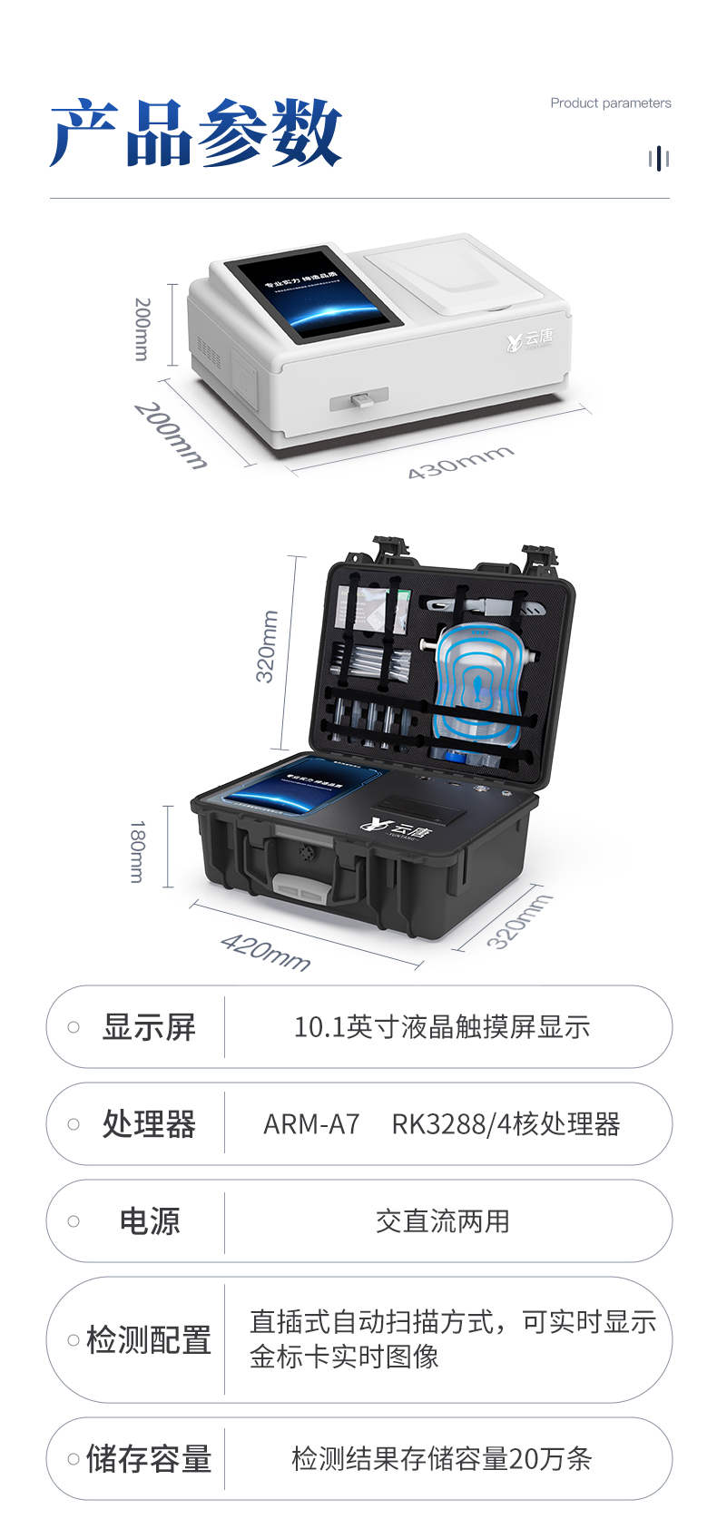 | 仪器采用10.1英寸液晶触摸屏显,搭配运行安卓智能操作系统,主控芯片采用ARM Cortex-A7,RK3288/4核处理器,主频1.88Ghz,运转速度更快速,性能更强。 | 仪器功能包括:胶体金检测模块、数字化管理模块、无线通讯模块等,可以满足同一软件下实现所有检测项目的检测,并在同一窗口展示检测结果。 | 一体化台式快检设备,采用交直流两用供电方式,可连接车载电源,配备6ah大容量充电锂电池,可以满足现场及流动检测使用的需求。仪器尺寸:43×35×20cm, 主机净重:5.1kg | 系统自带数据集成模块,设备首页自动统计检测数据包含:周检测数据、月检测数据,全部检测总数量,均包含检测总数,合格数,不合格数,以及相关柱形分析图,对各项检测数据清晰掌握,无需电脑查询,更加快捷直观。 | 仪器具有任务预设模块,可在样品送检前提前预设样品名称、检测指标、送检单位等信息,样品送检时一键调取保存信息,检测更加方便快捷。 | 胶体金检测模块: 直插式自动扫描方式,可实时显示金标卡实时图像,系统自动分析并呈现出CT曲线图,CT线自动识别,无需手动调整,完成检测后自动退出检测卡。 结果判定线可修改,对照值标定值可保存,断电不丢失数据。 兼容市场上其他胶体金卡,使用耗材不受限制,极大增强用户使用体验。 | 仪器检测系统拥有庞大数据库,并且构建了完善的检索、修订功能。食品库涵盖多种样品名称,可按需添加或删除、编辑样品名称;产品数据库以及历史检测记录支持一键检索功能。 | 系统打印自定义化,打印格式多样化,产品合格证(国家标准要求),二维码,抽样信息、检测信息,受检信息、复核信息、抽样日期、检测日期等信息结果,可按需求自行设置打印内容。 | A4纸版本报告打印功能(可选配):设备拥有两种结果展示方式,可以自动生成A4打印模板和小票打印模板两种样式,可通过WiFi及网线等方式链接外置打印机可进行打印 | 仪器具有 wifi 联网上传、RJ45网线连接功能,可以快速上传数据。同步对接监管平台,数据可局域网和互联网数据上传,检测结果直接传至食品安全监管平台。进行区域食品安全监管及大数据分析处理与数据统计,检测区域食品安全长短期动态,达到食品安全问题预估、预警。 | 设备支持U盘存储,标准USB接口,免驱动安装。检测结果存储容量20万条以上,可生成Excel表格,进行一键拷贝,并具有登录保护功能,可设置用户名及密码,规范不同人员操作权限,防止非工作人员操作,并且可以进行重新校准、锁定、恢复出厂设置功能。仪器固件可升级,后期检测项目可扩充。 | 仪器具备远程升级功能,可定向分客户分仪器更新,开机后自动更新,并可持续性免费更新系统版本,无需像传统产品返厂更新,节省时间及人力成本并避免了物流运输返厂升级导致设备损坏的潜在风险。 |