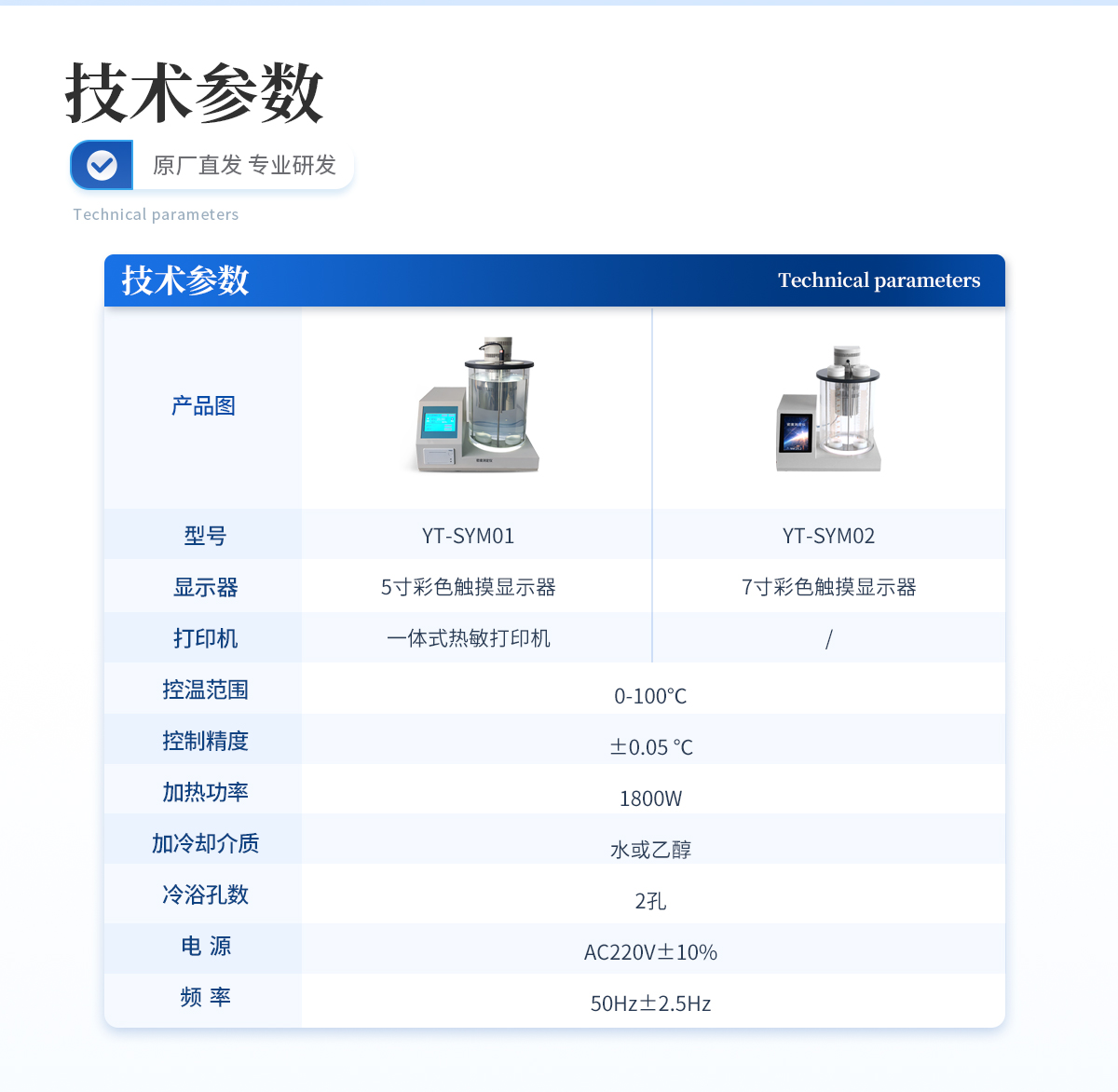 | ★显示器:5寸彩色触摸显示器 | ★打印机:一体式热敏打印机 | ★控温范围:0-100℃ | ★控制精度:±0.05 ℃ | ★加热功率:1800W | ★加冷却介质:水或乙醇 | ★冷浴孔数:2孔 | ★电 源:AC220V±10% | ★频 率:50Hz±2.5Hz |