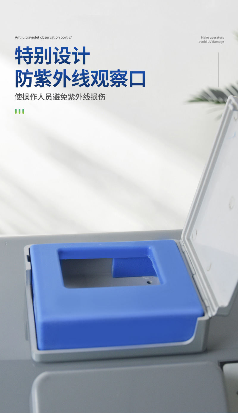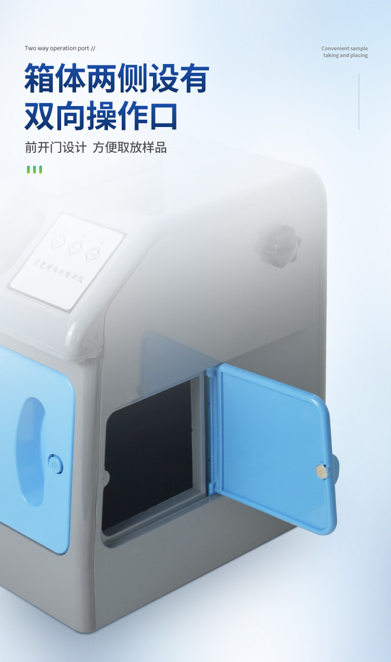 | ★依据行标:NY/T1257-2006 | ★仪器箱体两侧设有双向操作口,前开门设计,方便取放样品。 | ★用户可通过箱体直接观察到暗室内的样品。 | ★特别设计防紫外线观察口,使操作人员避免紫外线损伤。 | ★紫外短波波长:254nm | ★紫外长波波长:365nm | ★可见光源 | ★紫外滤色片尺寸:200×50mm | ★工作电源: 220V交流电源 | ★使用温度: 0℃-40℃ | ★使用湿度:<90% (40℃) | ★仪器功耗: 20W | ★外型尺寸:300×200×290mm |