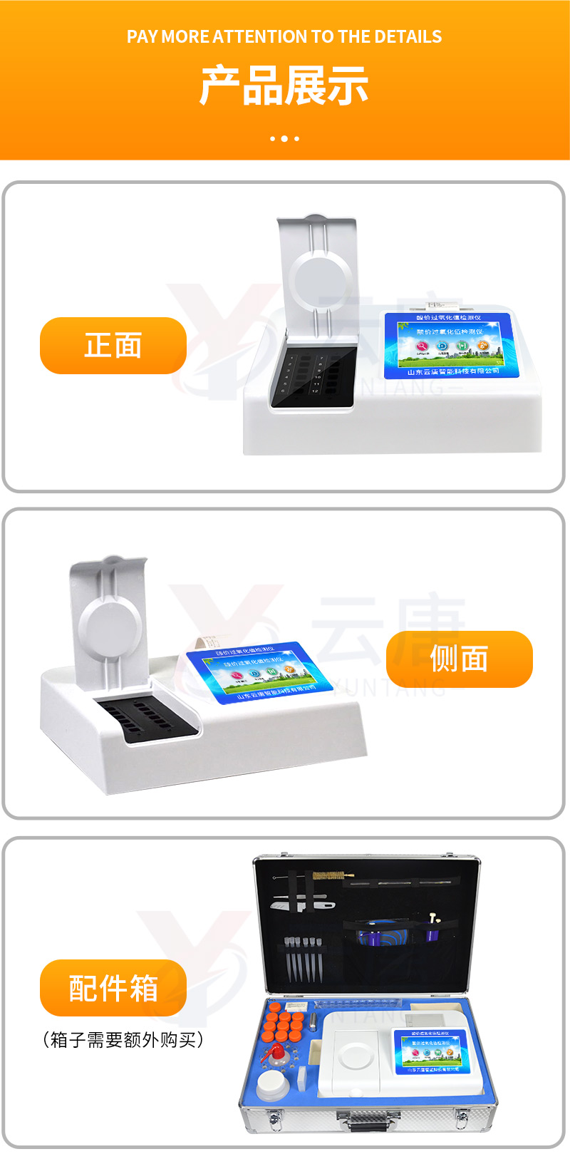 | 仪器采用台式一体化系统检测技术,将分光光度模块、新型农残检测模块、数字化管理模块、无线通讯模块高度集成于一体,支持检测200种食品安全检测项目,同时预留升级检测方法。 | 仪器检测模块标准化、智能化,可随意自由组合。检测箱体内置多个标准检测单元,检测模块可以调整配置。 | 仪器采用全新安卓智能系统,主控芯片采用 ARM Cortex-A7,RK3288/4核处理器,10.1寸高清液晶触摸竖屏,更加**的UI交互界面,运转快捷;仪器配备无线通信模块: 4G(APN)通讯模块、Wifi模块,蓝牙传输,同时具有双USB接口以及RJ45接口能以多种方式实现数据保存和数据传输功能。 | 创新检测模式: | ★检测通道:≥12通道;采用精密旋转比色池设计,使用同芯片同光源校准精度,解决不同光源之间的误差值。1-12通道间误差0.1%。(***:**202022821055.2) | ★仪器具有自动识别比色皿检测功能,即:将样品比色皿放入仪器后,点击样品检测,仪器自动识别比色皿进行通道检测。 | 进口高精光源: | 高精度进口四波长冷光源,通道配置 410、520、590、630nm 波长光源,一个光源芯片驱动一个光源,误差极小,每台设备单独**校准光源,**比对,同时参照四种不同波段光源全方位覆盖市面上99%的农残食品项目检测。 | 智能化操作系统: | 便捷操作系统:设备检测时可在同一检测界面自动对应相关检测通道一次性选择1-12个样品名称,无须退出界面,节省操作时间。 | 数据集成系统:设备首页自动统计检测数据包含:周检测数据、月检测数据,全部检测总数量,均包含检测总数,合格数,不合格数,以及相关柱形分析图,对各项检测数据清晰掌握,无需电脑查询,更加快捷直观。 | 项目预设系统:支持添加单个及多个相同或不相同的任务预设,一键快速调取,每一个任务分别可以设置不同的样品、批次、编号、来源、备注、抽样信息、检测信息、受检信息、复核信息等更多信息。无缝链接平台和APP实时查看下发任务。 | 数据监管系统:同步对接监管平台,数据可局域网和互联网数据上传,检测结果可选择直接传至食品安全监管平台。集成OSS输出存储服务、区分设备定向管理应用,进行区域食品安全监管及大数据分析处理与数据统计,检测区域食品安全长短期动态,达到食品安全问题预估、预警。 | 自定义打印系统:内置全新打印系统,新创自定义打印方式,可按需灵活设置开启或关闭:产品合格证(国家农业部标准要求),二维码,抽样信息、检测信息,受检信息、复核信息、抽样日期、检测日期等信息的打印。 | 系统远程更新功能:可定向分客户分仪器更新系统,按照不同客户后期实际需求添加项目,无需机器返厂,即可远程实时升级全新系统,节省时间成本及避免运输造成设备损坏。 | 仪器主机采用一体化防水、抗压、防撞击、防腐蚀箱体设计,同时配备交直流供电,可连接车载电源,可选配大容量充电锂电池,满足现场野外检测需求。 | 安全证书,放心保障:仪器具有中国计量科学研究院校准证书,权威认证。 |