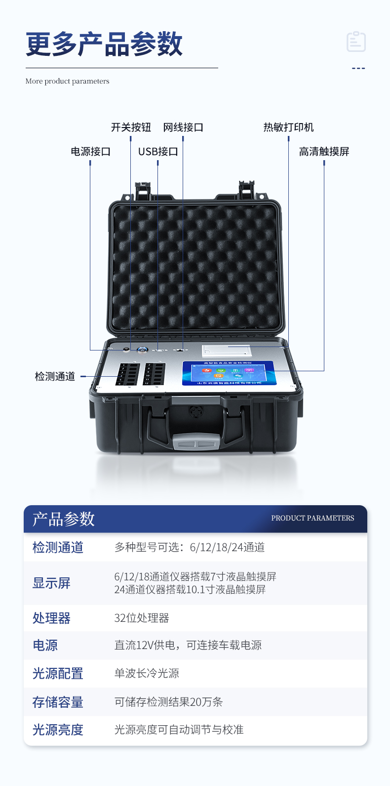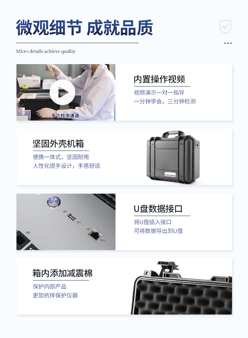 | 仪器采用手提式一体化系统检测技术,将分光光度模块、新型农残检测模块、数字化管理模块、无线通讯模块高度集成于一体,支持检测200种食品安全检测项目,同时预留升级检测方法。 | 仪器检测模块标准化、智能化,检测项目可随意自由组合。检测箱体内置多个标准检测单元,检测模块可以调整配置。 | 显示屏幕:仪器采用10.1英寸竖向液晶触摸屏显,搭配运行安卓智能操作系统,主控芯片采用ARM Cortex-A7,RK3288/4核处理器,主频1.88Ghz,操作方便,性能更强。 | 检测通道:≥12通道;采用精密旋转比色池设计,使用同芯片同光源校准精度,解决不同光源之间的误差值,更加准确**。(1-12通道间误差0.1%,***:**202022821055.2) | 仪器光源:高精度进口四波长冷光源,每个通道均配置 410、520、590、630nm 波长光源,标配**的光路切换装置,专利光路切换功能可实现64波长,并且所有检测项目可实现所有通道同时检测。 | 设备可一键校准,自动保存校准数据,自动对比校验,得到精准光源,采用Android SP存储数据,光源数据永不丢失,方便每一次使用。 | 通讯接口:配备无线通信模块、4G(APN)通讯模块、蓝牙传输,同时具有双USB接口以及RJ45网线接口,可以多方式实现数据保存及数据传输 | 存储方式:支持U盘存储,标准USB接口,免驱动安装。检测结果存储容量20万条以上,可生成Excel表格进行拷贝,并具有登录保护功能。 | 智能化操作系统: | 1)操作系统:仪器可在同一检测界面自动对应相关检测通道,一次性选择1-12个样品名称,无需退出界面,节省操作时间。并可以对每个通道属性和样品信息单独进行编辑,例如送检单位、人员,检测人员等,打印时勾选打印显示。 | 2)数据集成系统:设备首页自动汇总分析检测数据,包含:周检测数据、月检测数据,全部检测总数量,均包含检测总数,合格数,不合格数,以及相关柱形分析图,各项检测数据一目了然,无需电脑查询,更加快捷直观。 | 3)数据库系统:十几项数据库分类管理仪器:包含项目类型、项目数据、检测数据、历史记录、国标信息、曲线信息、采样信息、检测信息、受检信息、复核信息、图表信息、光源校准信息、打印样式信息、样品库信息等等,数据库之间互相协调联动保证数据的真实完整性。同时产品数据库以及历史检测记录支持一键检索功能。 | 4)限量规判系统:具有限量查询、添加物质合规判定系统。检测出结果后,系统自动调用系统数据库中相关国标进行比对判定,客观显示判定结果是否合格。 | 5)项目预设系统:仪器具有任务预设模块,一键提前预设,给出方便快捷的新检测方案,每一个任务分别可以设置不同的样品、批次、编号、来源、备注、抽样信息、检测信息、受检信息、复核信息等更多信息。样品送检时一键调取保存信息,并可多次调取,大大提高检测效率。 | 6)数据监管系统:同步对接监管平台,数据可局域网和互联网数据上传,检测结果可选择直接传至食品安全监管平台。进行区域食品安全监管及大数据分析处理与数据统计,检测区域食品安全长短期动态,达到食品安全问题预估、预警。 | 7)打印系统:内置全新打印机,新创自定义打印方式,可按需灵活勾选控制:产品合格证(国家农业部标准要求),二维码,抽样信息、检测信息,受检信息、复核信息、抽样日期、检测日期等信息的打印。 | 供电模式:仪器交直流两用,直流12V供电,可连接车载电源,可配6ah大容量充电锂电池,电量可实时显示,方便户外流动测试。 | 胶体金检测模块:采用双通道CMOS成像处理技术及胶体金免疫层析技术,可同时读取双胶体金卡数据,自动采集、处理分析,将检测结果显示,并可根据参考限值自动判断检测结果,可检测常见的兽药残留、生物毒素、抗生素、违禁添加物等。 | 1)探测技术:CMOS成像探测; | 2)检测通道:1个通道; | 3)检测方式:消线法和比色法; | 4)显示模式:阴性或阳性; | 5)曲线形式:轨道式扫描方式,显示金标卡图像,实时生成、识别CT曲线图,无需手动调整,完成检测后自动退出检测卡。兼容市场上其他金标卡,使用耗材不受限制。 | 仪器加入远程升级功能,可定向分客户分仪器更新,开机后自动更新,客户无需任何操作,即可升级全新项目。做到了无需退换机器即可实现实时远程升级检测仪器。 |