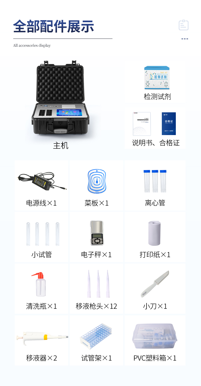 该多功能食品安全检测仪为集成化食品安全快速检测分析设备,广泛应用于市场监管局、食品肉产品深加工企业、学校食堂、卫生部门、畜牧部门、屠宰场、检验检疫部门等单位使用。